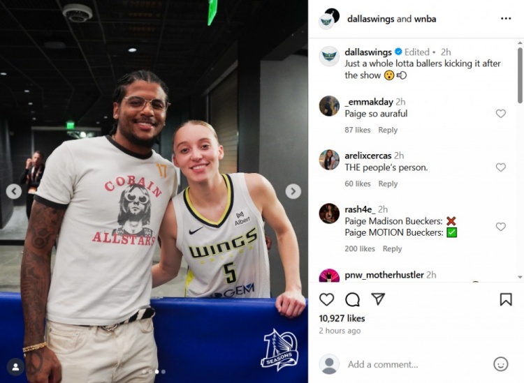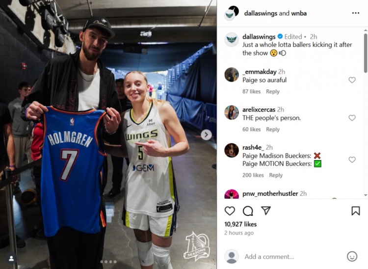 賽后,飛翼官方曬出了布克斯與太陽(yáng)球員杰倫-格林以及雷霆球員切特-霍姆格倫的合影,并配文道:“不過(guò)是一群大佬在精彩表現(xiàn)后聚在一起罷了?????”