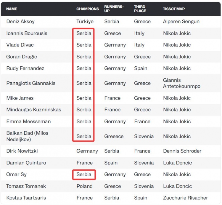 2009年至今,塞爾維亞男籃堪稱無冕之王,5次打進(jìn)大賽決賽,5次全部折戟,09年歐錦賽決賽輸給了西班牙、14年世界杯決賽輸給了美國、16年里約奧運(yùn)會(huì)決賽輸給了美國、17年歐錦賽決賽輸給了斯洛文尼亞、23年世界杯決賽輸給了德國。去年的巴黎奧運(yùn)會(huì),他們獲得銅牌。