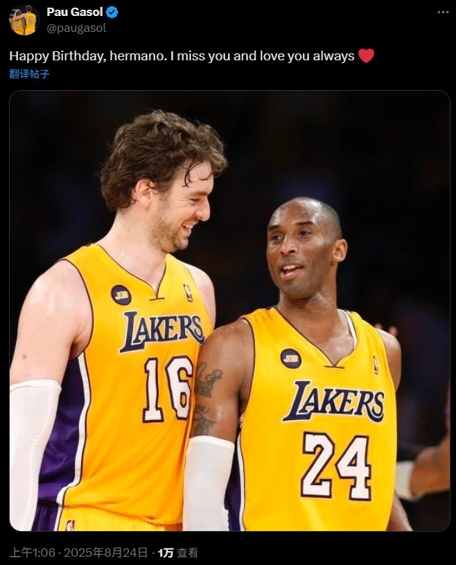 8月24日訊 今天是科比的生日,加索爾更推為科比