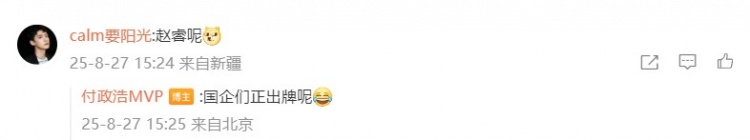 有網(wǎng)友問(wèn)趙睿的情況,付政浩回復(fù):“國(guó)企們正出牌呢?!?/p>