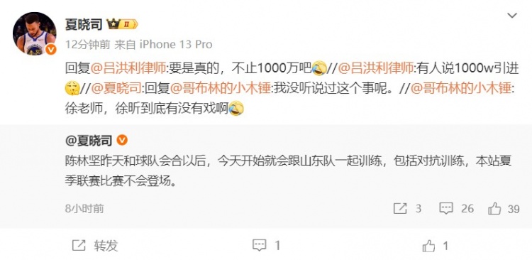 有網(wǎng)友詢問山東引進(jìn)徐昕的可能性,夏曉司表示沒聽說過。另外有網(wǎng)友稱有山東1000萬引進(jìn)徐昕的流言,對此夏曉司回復(fù):“要是真的,不止1000萬吧。”