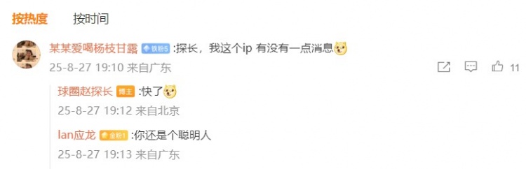 對(duì)一名IP歸屬地為廣東的網(wǎng)友的詢問,@球圈趙探長(zhǎng) 回復(fù):“快了。”