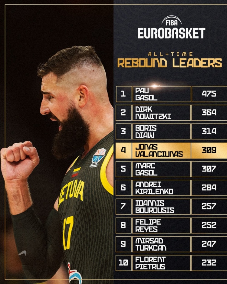 這樣一來,他歐錦賽的總籃板數來到了309個,超越了小加索爾的307個,升至歐錦賽歷史第4位。而前三位分別是:大加索爾的475個、諾維茨基的364個以及鮑里斯-迪奧的314個。