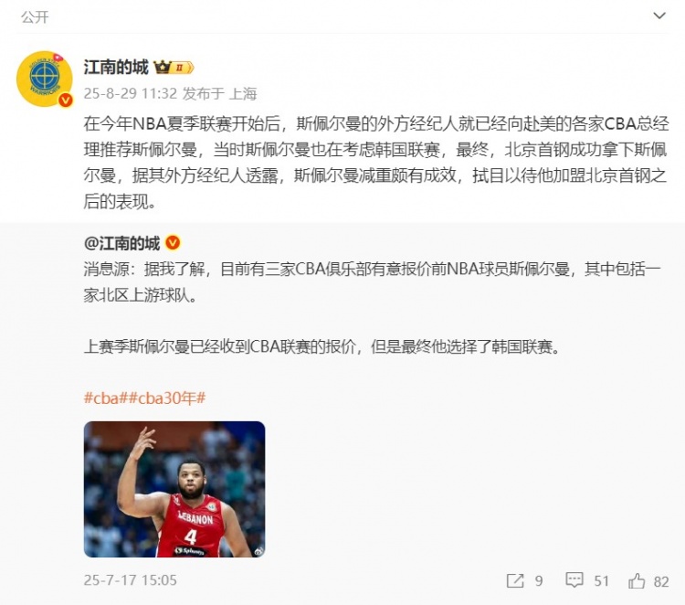 @江南的城 在個(gè)人微博上寫(xiě)道:“在今年NBA夏季聯(lián)賽開(kāi)始后,斯佩爾曼的外方經(jīng)紀(jì)人就已經(jīng)向赴美的各家CBA總經(jīng)理推薦斯佩爾曼,當(dāng)時(shí)斯佩爾曼也在考慮韓國(guó)聯(lián)賽,最終,北京首鋼成功拿下斯佩爾曼,據(jù)其外方經(jīng)紀(jì)人透露,斯佩爾曼減重頗有成效,拭目以待他加盟北京首鋼之后的表現(xiàn)。”