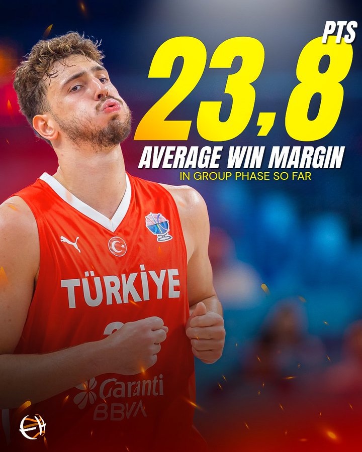 根據(jù)數(shù)據(jù)統(tǒng)計,這波4連勝期間,土耳其男籃場均贏23.8分。