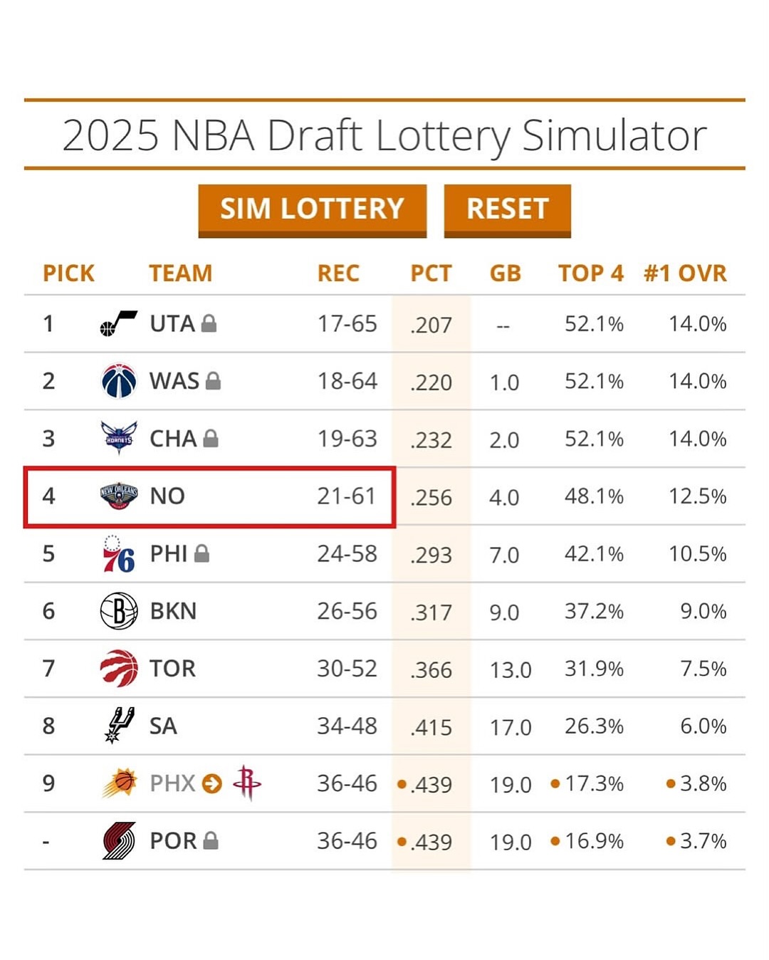 知名選秀網(wǎng)站tankathon顯示,鵜鶘擁有第四好的樂透抽簽幾率,并且擁有12.5%的狀元簽幾率。