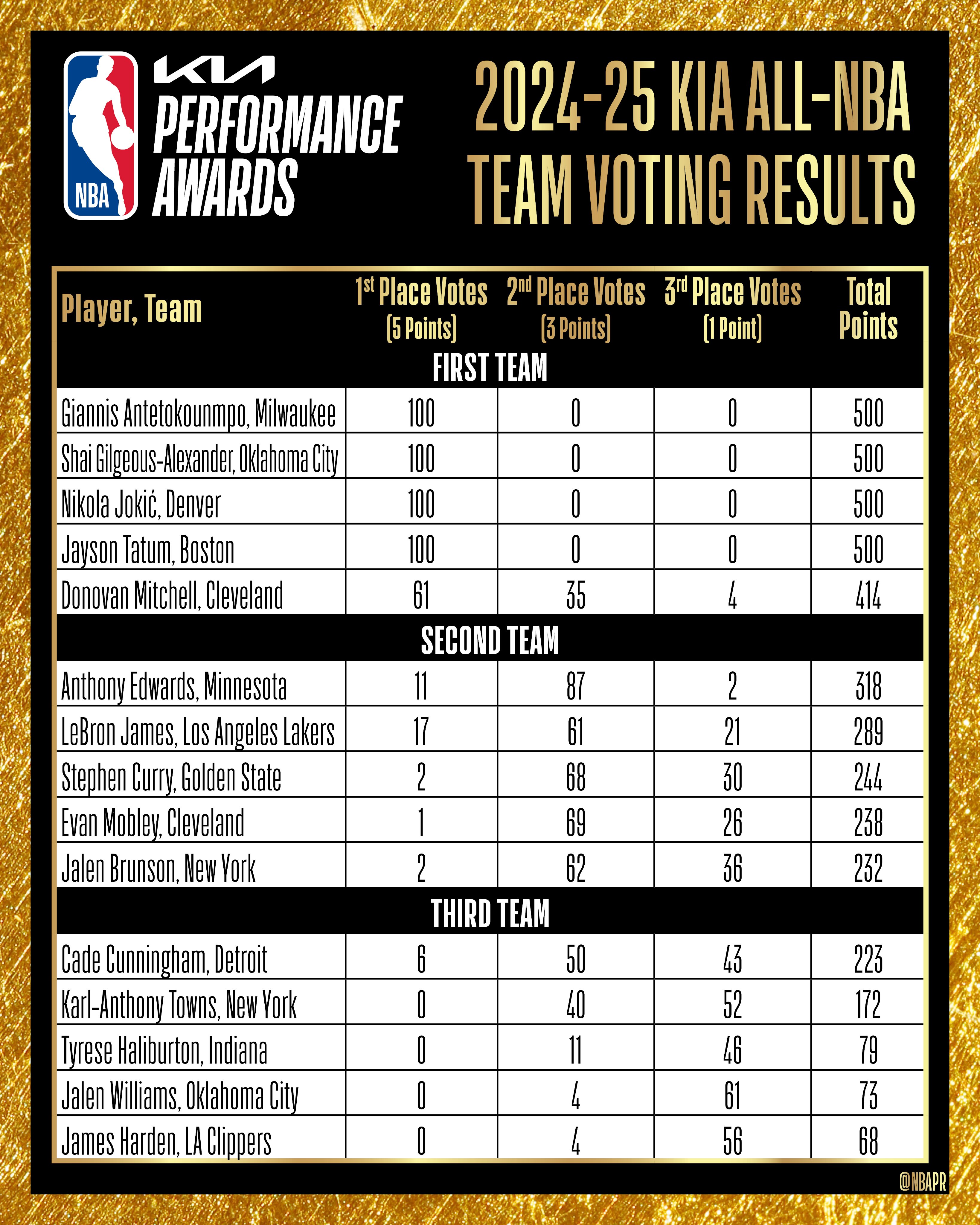 05月24日訊 2024-25賽季NBA最佳陣容出爐,三陣具體人員如下: