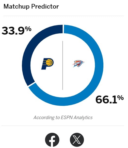 ESPN更新總決賽G2勝率:雷霆66.1%被看好 步行者33.9%