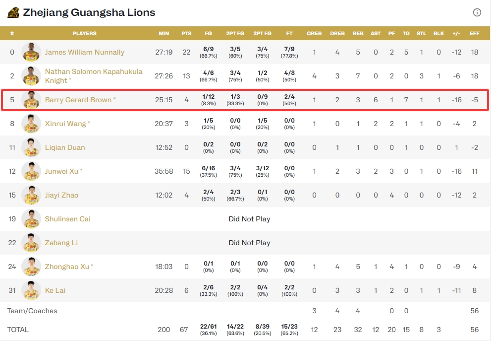 本場比賽,CBA總決賽MVP小巴里-布朗表現(xiàn)不佳,他12投1中,三分9中0,罰球4中2,得到4分3籃板6助攻7失誤1搶斷1蓋帽,正負(fù)值-16。