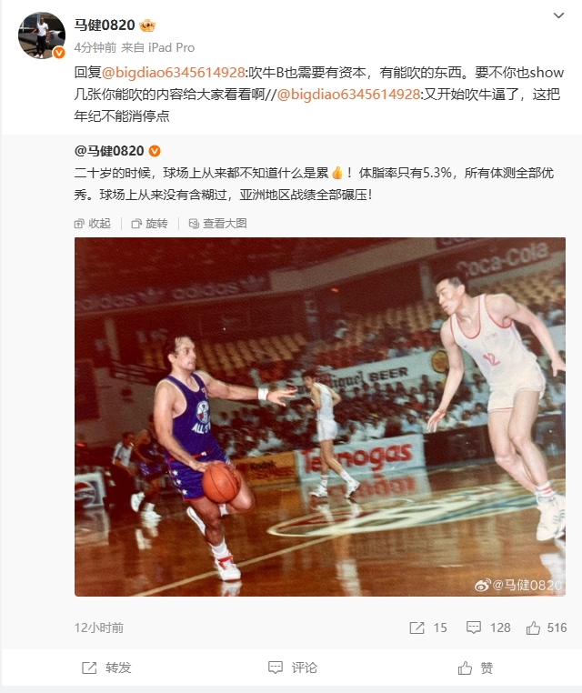 “二十歲的時(shí)候,球場上從來都不知道什么是累??!體脂率只有5.3%,所有體測全部優(yōu)秀。球場上從來沒有含糊過,亞洲地區(qū)戰(zhàn)績?nèi)磕雺海????”馬健寫道。