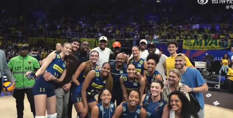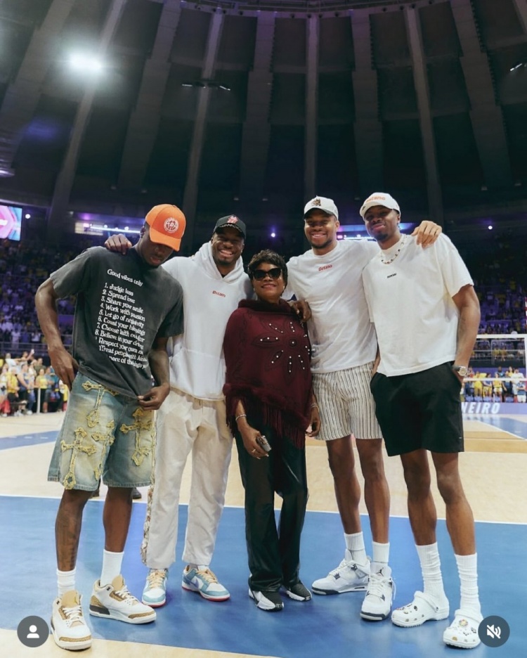 6月9日訊 今日,雄鹿球星字母哥攜哥哥薩納西斯(左二)、弟弟科斯塔斯(右一)、亞歷克斯(左一)還有母親前往巴西,觀看了2025世界女排聯(lián)賽分站賽第一周巴西女排vs意大利女排的比賽,賽后還與女排隊(duì)員親切合影。
