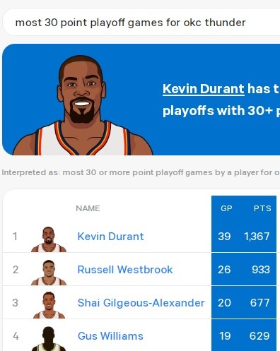 據(jù)統(tǒng)計(jì),在雷霆/超音速隊(duì)史季后賽30+場(chǎng)數(shù)排名中,KD39場(chǎng)排第一,威少26場(chǎng)排第二,亞歷山大20場(chǎng)排第三,第四是?超音速名宿古斯-威廉姆斯的19場(chǎng),今日亞歷山大已完成超越。