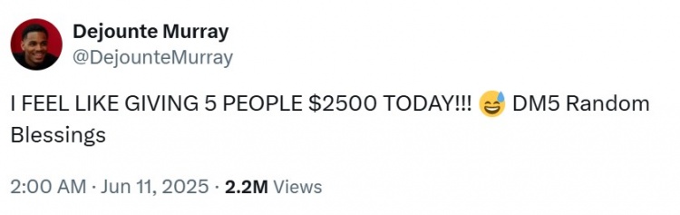 穆雷寫(xiě)道:“我今天我今天想給5個(gè)人每人2500美元?。?! ?? 請(qǐng)私信我,隨機(jī)送出祝福。”