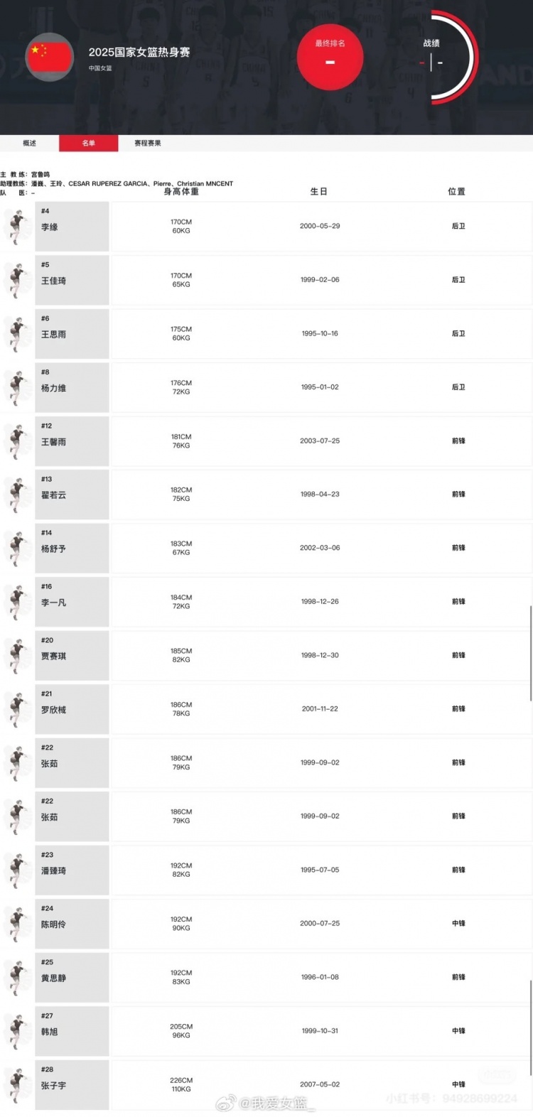 【中國女籃熱身賽名單公布 張子宇有望上演國家隊(duì)首秀】今晚19:30,中國女籃將在山東臨沂奧體中心體育館迎戰(zhàn)波黑女籃,打響今夏熱身賽首戰(zhàn)。中國女籃16人參賽名單如下:李緣、王佳琦、王思雨、楊力維、王馨雨、翟若云、楊舒予、李一凡、賈賽琪、羅欣棫、張茹、潘臻琦、陳明伶、黃思靜、韓旭以及有望迎來成年國家隊(duì)首秀的小將張子宇。值得注意的是,李夢(mèng)、陳玉婕缺席本次熱身賽名單,波黑隊(duì)最大牌球員瓊奎爾-瓊斯因征戰(zhàn)WNBA無緣此次比賽。(完整名單詳見配圖)