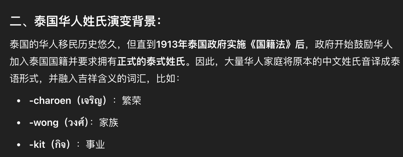 以上內(nèi)容,你可以看到Tungkitkancharoen這個(gè)姓氏的演變,看到一個(gè)姓氏不僅僅只是一個(gè)名字符號(hào),背后還承載著歷史的回聲。它也是一個(gè)家族為了適應(yīng)國(guó)家政策的印記,是祖先文化的痕跡,是一個(gè)人身份合法性的載體,也記錄了個(gè)體和群體在遷徙的過(guò)程中試圖融合與抵抗的過(guò)程,是身份、記憶、權(quán)力與文化的濃縮。
