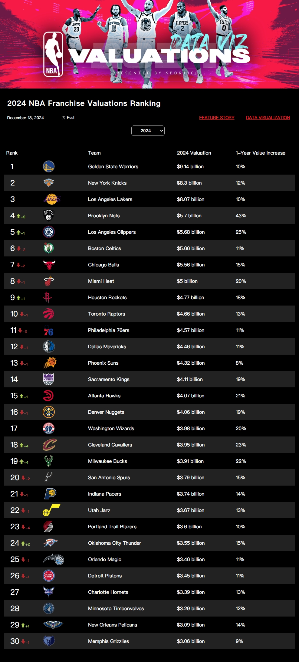 去年底,知名美媒Sportico發(fā)布了2024年NBA30支球隊(duì)的市值報(bào)告,數(shù)據(jù)顯示,目前NBA球隊(duì)的平均市值約為46億美元,總價(jià)值比相較2023年上漲了15%,幾乎是四年前的兩倍,當(dāng)時(shí)的平均市值約為23.7億美元,哪些球隊(duì)市值瘋狂飆升呢?今天老震來(lái)盤(pán)點(diǎn)一下(市值單位均為美元,括號(hào)內(nèi)為24年對(duì)比23年排名變動(dòng),-代表下降,+代表上升,未標(biāo)明則代表排名不變)。