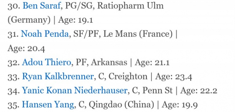 其中,來自中國的中鋒楊瀚森排在第35位。
