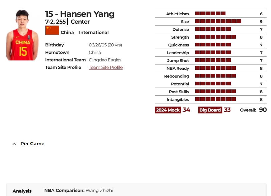 06月22日訊 老牌選秀網(wǎng)站NBADraft更新了楊瀚森的選秀報告。