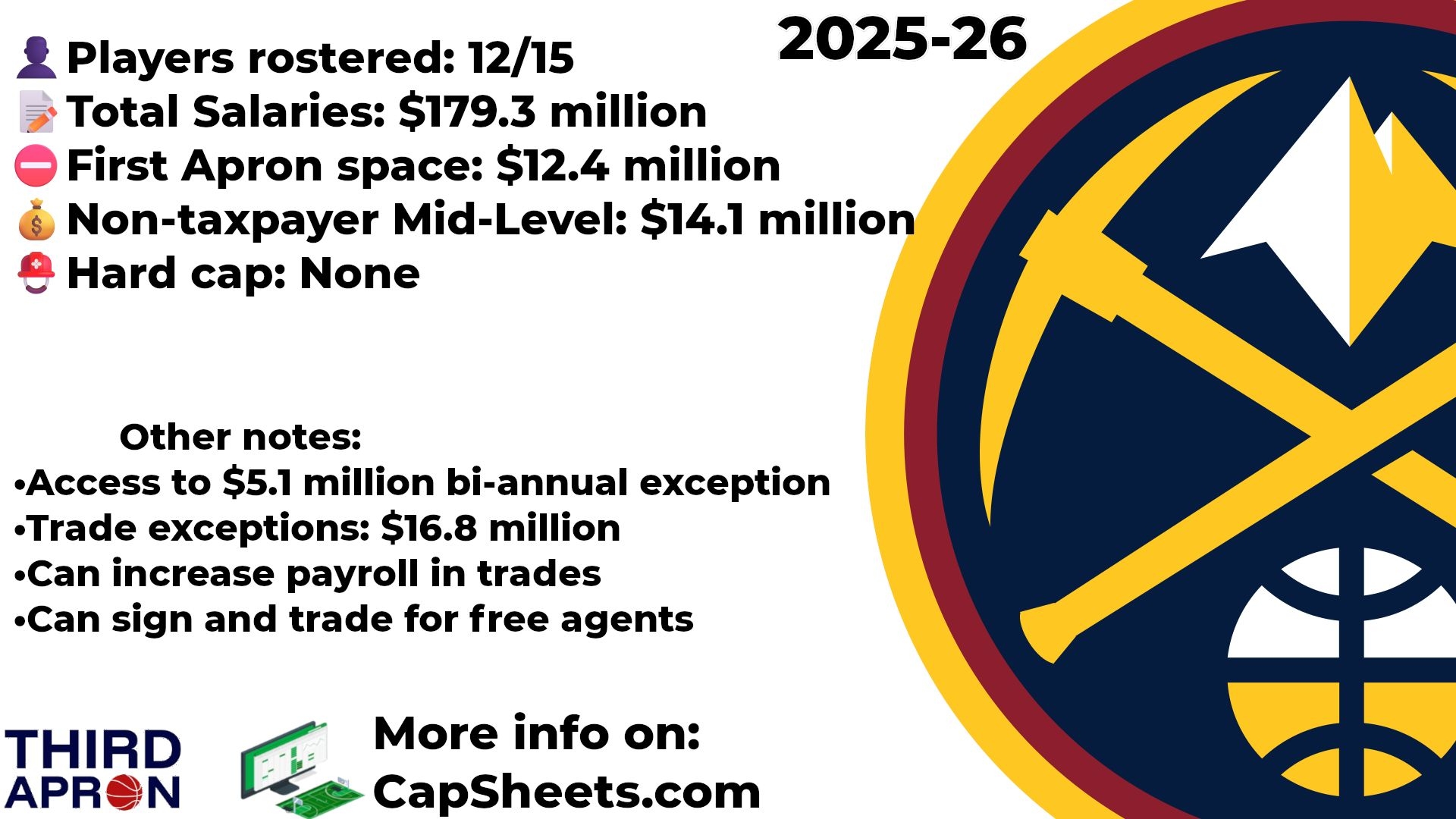 這筆交易幫助掘金節(jié)省了4000萬美元,創(chuàng)造1680萬美元的交易特例,還將球隊薪資降至奢侈稅線下( 約920 萬美元)。