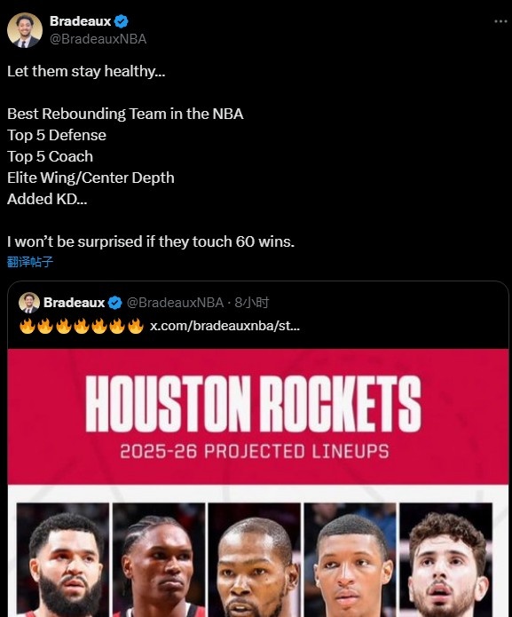 休媒 Bradeaux 寫道:“只要保持健康,如果下賽季火箭拿到 60勝我不會感到驚訝。我們隊籃板球聯(lián)盟最強(每場48.5個排第一);防守前五(防守效率110.3排第五);聯(lián)盟前五的頂級主帥;聯(lián)盟頂級的側(cè)翼 / 內(nèi)線輪換深度;還有一個杜蘭特?!?/p>