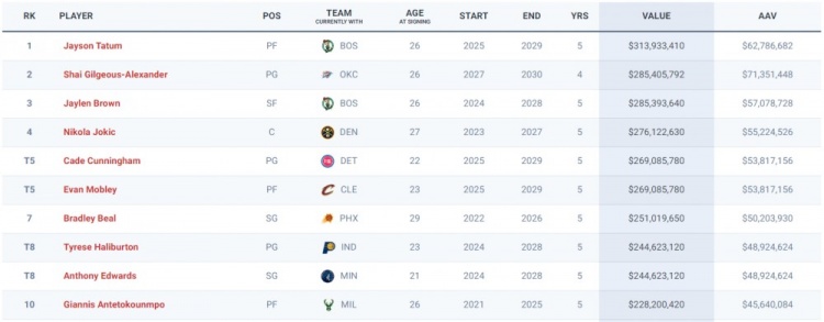 根據(jù)數(shù)據(jù)統(tǒng)計(jì),亞歷山大這份合同是NBA歷史金額第二大的合同,僅次于塔圖姆2024年簽下的5年3.14億。