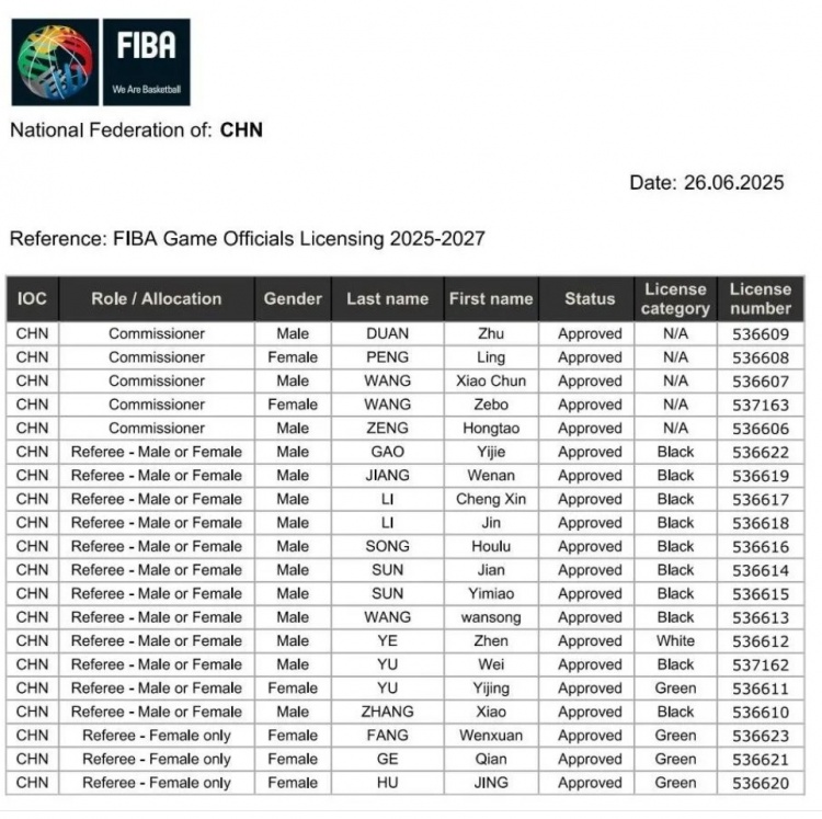 7月2日訊 近日,F(xiàn)IBA正式公布了2025-2027周期全球籃球裁判員及臨場代表注冊(cè)名單。其中,中國共有20位專業(yè)人士入選,涵蓋臨場代表(Commissioner)和裁判員(Referee)兩大類別,展現(xiàn)了中國籃球裁判體系的國際化水準(zhǔn)。