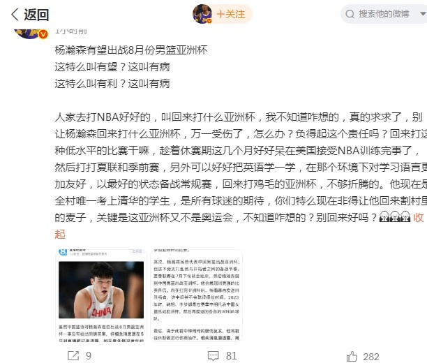 “人家去打NBA好好的,叫回來(lái)打什么亞洲杯,我不知道咋想的,真的求求了,別讓楊瀚森回來(lái)打什么亞洲杯,萬(wàn)一受傷了,怎么辦?負(fù)得起這個(gè)責(zé)任嗎?回來(lái)打這種低水平的比賽干嘛,趁著休賽期這幾個(gè)月好好呆在美國(guó)接受NBA訓(xùn)練完事了,然后打打夏聯(lián)和季前賽,另外可以好好把英語(yǔ)學(xué)一學(xué),在那個(gè)環(huán)境下對(duì)學(xué)習(xí)語(yǔ)言更加友好,以最好的狀態(tài)備戰(zhàn)常規(guī)賽,回來(lái)打雞毛的亞洲杯,不夠折騰的。他現(xiàn)在是全村唯一考上清華的學(xué)生,是所有球迷的期待,你們特么現(xiàn)在非得讓他回來(lái)割村里的麥子,關(guān)鍵是這亞洲杯又不是奧運(yùn)會(huì),不知道咋想的?別回來(lái)好嗎???????”該博主補(bǔ)充寫(xiě)道。