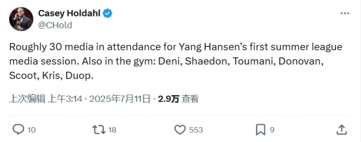 開(kāi)拓者隊(duì)記Casey Holdahl寫(xiě)道:“大約30家媒體參加了楊瀚森首次夏季聯(lián)賽媒體見(jiàn)面會(huì)。同樣在球館里的還有,阿夫迪亞、夏普、卡馬拉、克林根、亨德森、克里斯-穆雷、里斯?!?/p>