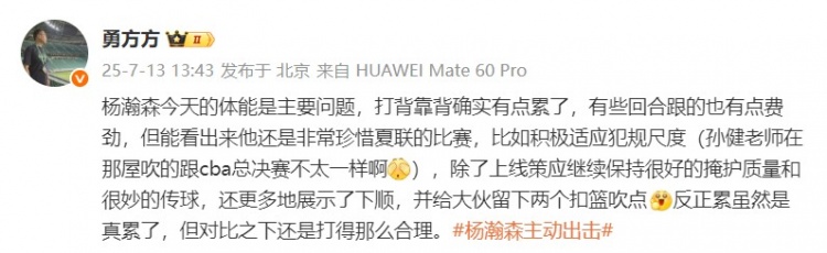 @勇方方 在個人微博上寫道:“楊瀚森今天的體能是主要問題,打背靠背確實有點累了,有些回合跟的也有點費勁,但能看出來他還是非常珍惜夏聯的比賽,比如積極適應犯規(guī)尺度(孫健老師在那屋吹的跟cba總決賽不太一樣?。?,除了上線策應繼續(xù)保持很好的掩護質量和很妙的傳球,還更多地展示了下順,并給大伙留下兩個扣籃吹點。反正累雖然是真累了,但對比之下還是打得那么合理?!?/p>