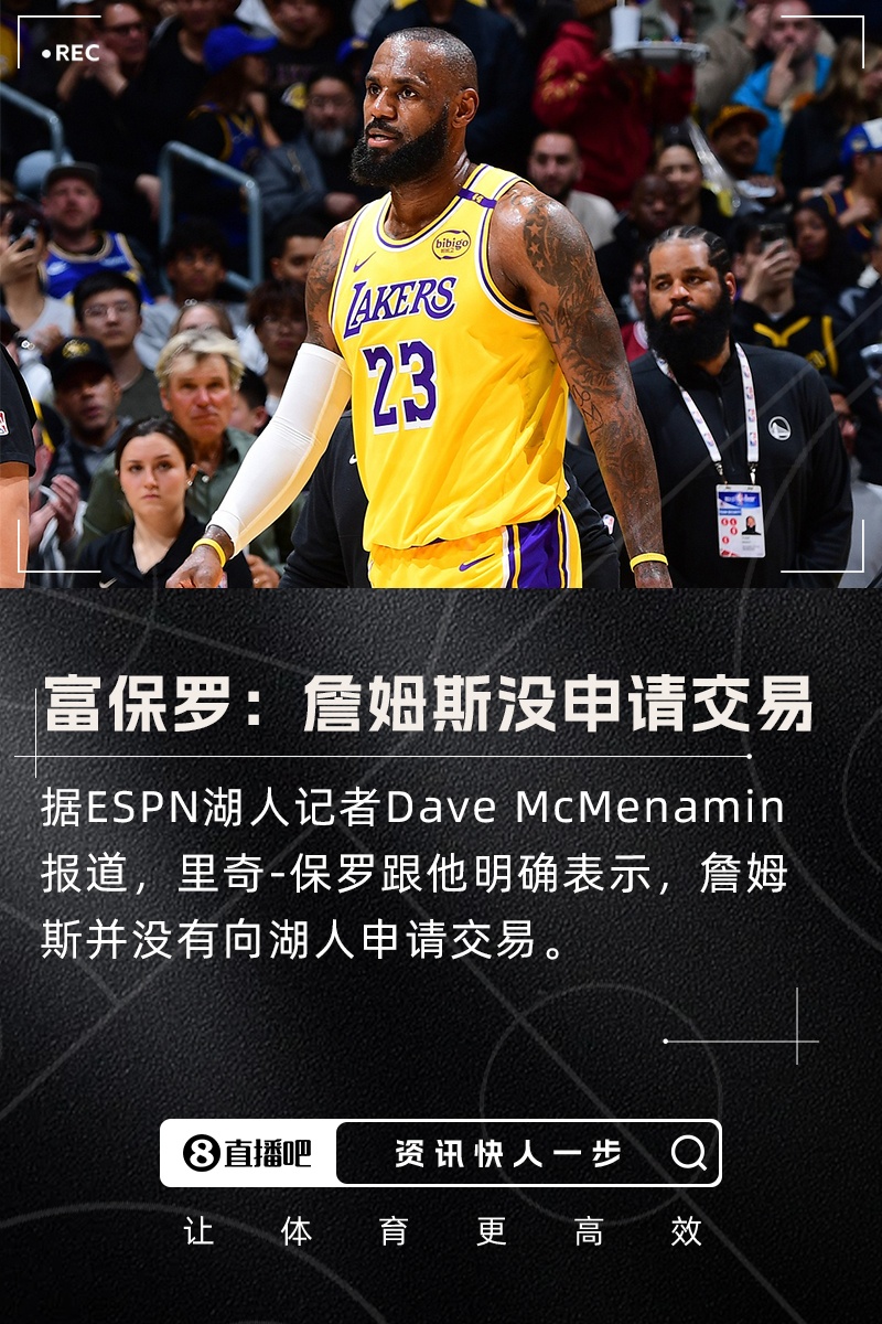 “勒布朗-詹姆斯的經(jīng)紀(jì)人里奇-保羅跟我說,有4支球隊聯(lián)系了他,表示有興趣交易得到勒布朗,”Dave McMenamin說道,“(里奇)保羅也向我明確表示,勒布朗并沒有申請交易,(里奇)保羅甚至沒有和湖人討論過未來想要交易的可能性。”