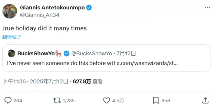 字母哥轉(zhuǎn)發(fā)并寫道:“霍勒迪經(jīng)常這么干?!?/p>