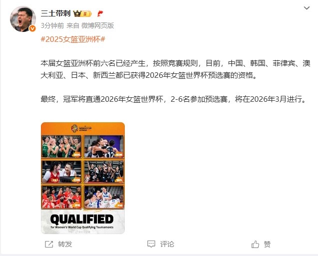 7月16日訊 據(jù)媒體人@三土帶刺報(bào)道,本屆女籃亞洲杯前六名已經(jīng)產(chǎn)生,按照競(jìng)賽規(guī)則,目前,中國(guó)、韓國(guó)、菲律賓、澳大利亞、日本、新西蘭都已獲得2026年女籃世界杯預(yù)選賽的資格。