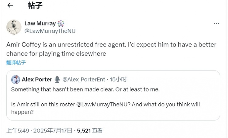 Law Murray在個(gè)人推特上寫(xiě)道:“科菲目前是完全自由球員。我預(yù)計(jì)他在其他地方會(huì)有更多的上場(chǎng)機(jī)會(huì)?!?/p>