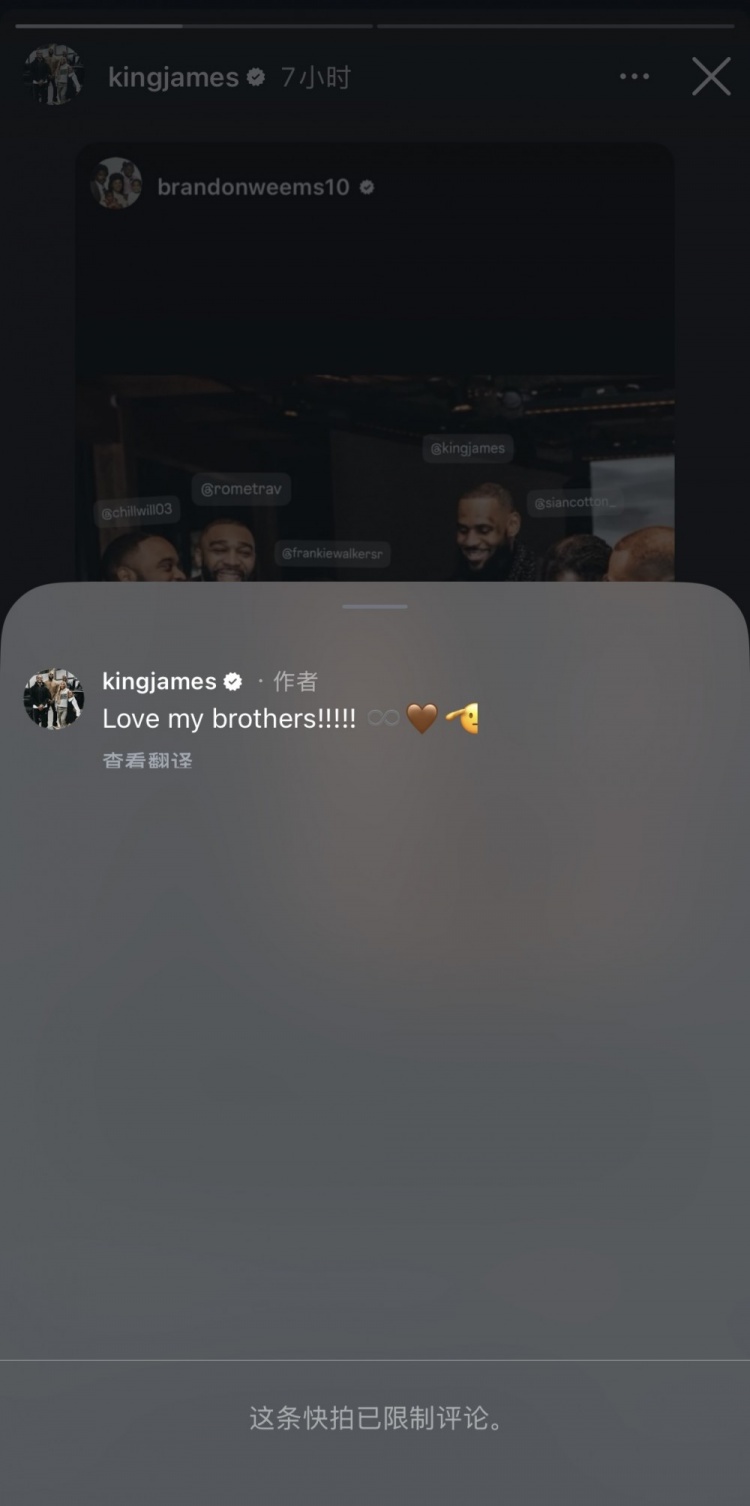 詹姆斯轉(zhuǎn)發(fā)并寫道:“愛我的兄弟們?。?!??????”