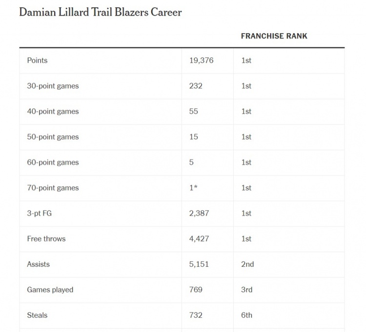 在開拓者隊(duì)史上,利拉德無疑有重要的意義,利拉德在開拓者得到19376分,隊(duì)史第一;232次砍下30+,55次砍下40+,15次砍下50+,5次砍下60+,1次砍下70+,2387記三分,4427記罰球,這些都是隊(duì)史第一;5151次助攻,隊(duì)史第二;出戰(zhàn)769場比賽,隊(duì)史第三;完成732次搶斷,隊(duì)史第6。