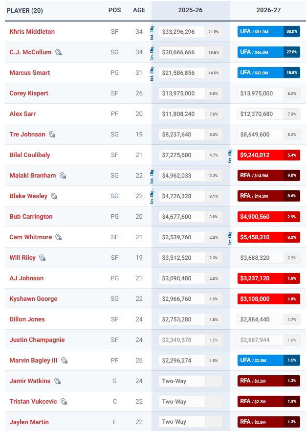 圖中2026-27(賽季)下方,藍(lán)色的為完全自由球員、棕色的為受限制自由球員、紅色的為球隊選項