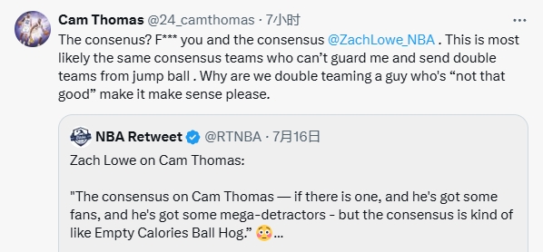 值得一提的是,卡梅隆-托馬斯本人不僅看見了這條評論,還在社交媒體上進(jìn)行了多次回復(fù):“狗屁共識!去你M的共識。那些認(rèn)為我不行的球隊,都從比賽開始就包夾我。既然覺得我'不怎么樣',干嘛還包夾我?解釋一下?!?/p>