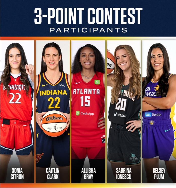 索尼婭-西特龍(神秘人)、凱特琳-克拉克(狂熱)(因傷缺席)、萊克西-赫爾(狂熱)(代替克拉克出賽)、艾麗莎-格雷(夢想)(上屆冠軍)、薩布里娜-約內(nèi)斯庫(自由人)(2023年三分大賽冠軍)、凱爾希-普拉姆(火花)。