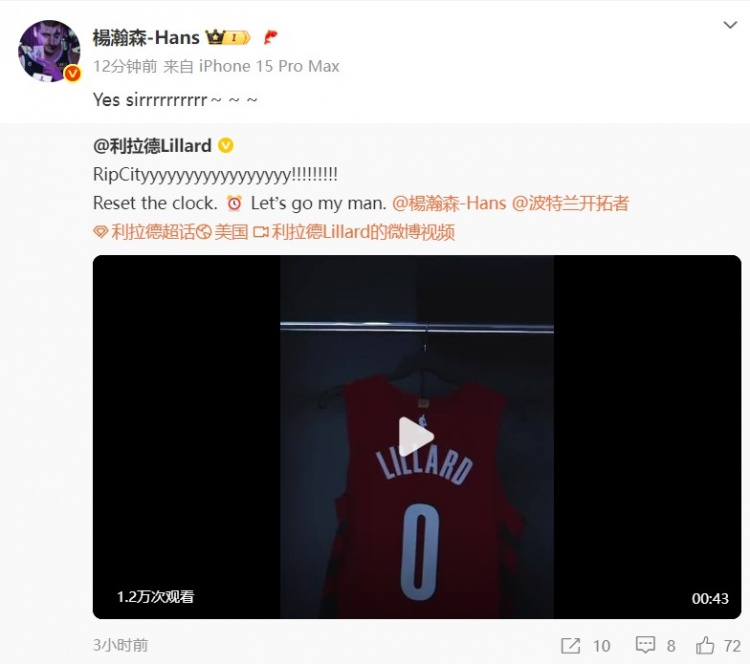 7月19日訊 楊瀚森今天更新微博,轉(zhuǎn)發(fā)了利拉德回歸開拓者的動(dòng)態(tài)。