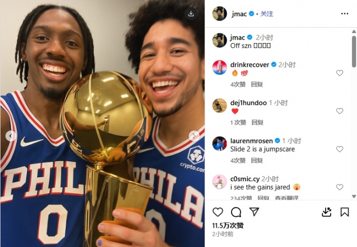 07月28日訊 今日,76人后衛(wèi)賈里德-麥凱恩在個人社交媒體上放出了一張他與隊友泰瑞斯-馬克西的AI奪冠合照。