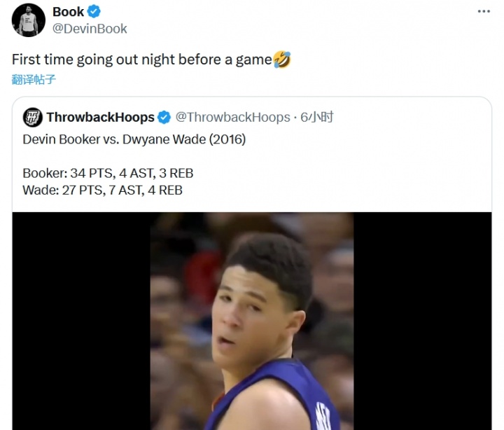 布克轉(zhuǎn)發(fā)并表示:“(這是我)第一次比賽前一天晚上出去玩兒??”