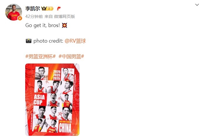 男籃歸化球員、現(xiàn)爵士球員李凱爾發(fā)博曬出男籃海報(bào),并寫道:“贏下勝利吧,兄弟們!??”