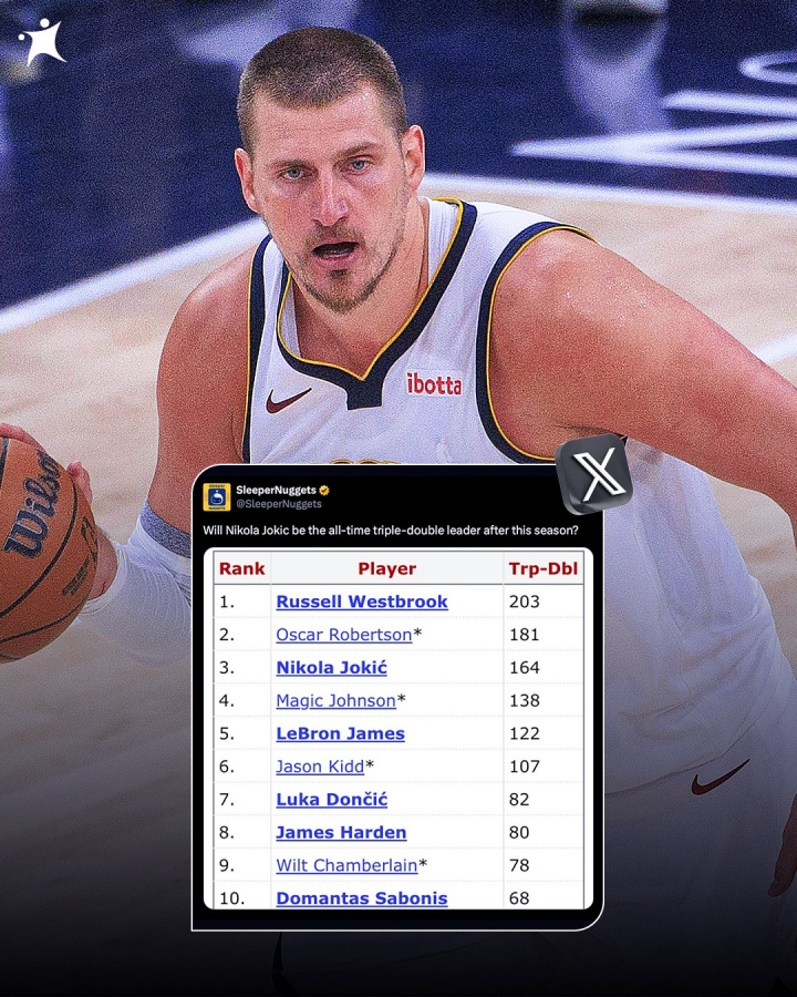 08月07日訊 掘金媒體SleeperNuggets更新動(dòng)態(tài)發(fā)問:“約基奇會(huì)在新賽季(2025-26賽季)結(jié)束之后成為NBA歷史三雙王嗎?”