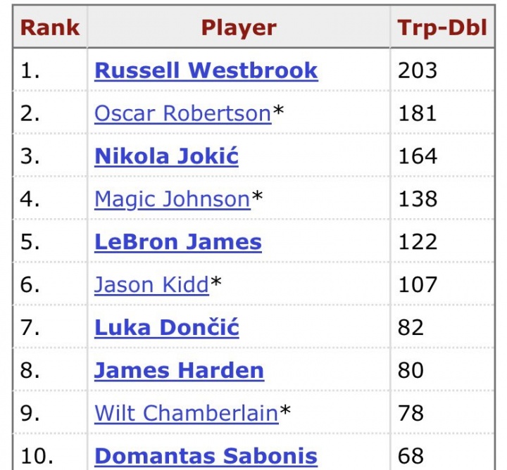 目前,約基奇以164次三雙排名NBA歷史第三位,距離超越榜首的威少(203次)還差40次,第二是奧斯卡-羅伯特森(181次)。