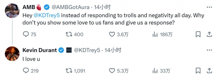 網(wǎng)友:“嘿杜蘭特,與其整天回復(fù)那些噴子和負(fù)面消息,為什么不向我們粉絲表達(dá)一些愛(ài)并給我們一個(gè)回復(fù)呢?”