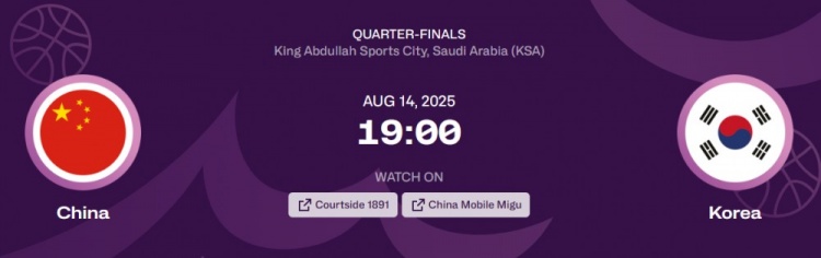 8月13日訊 今天,F(xiàn)IBA官方公布了男籃亞洲杯1/4決賽中國(guó)男籃對(duì)陣韓國(guó)男籃的比賽時(shí)間。