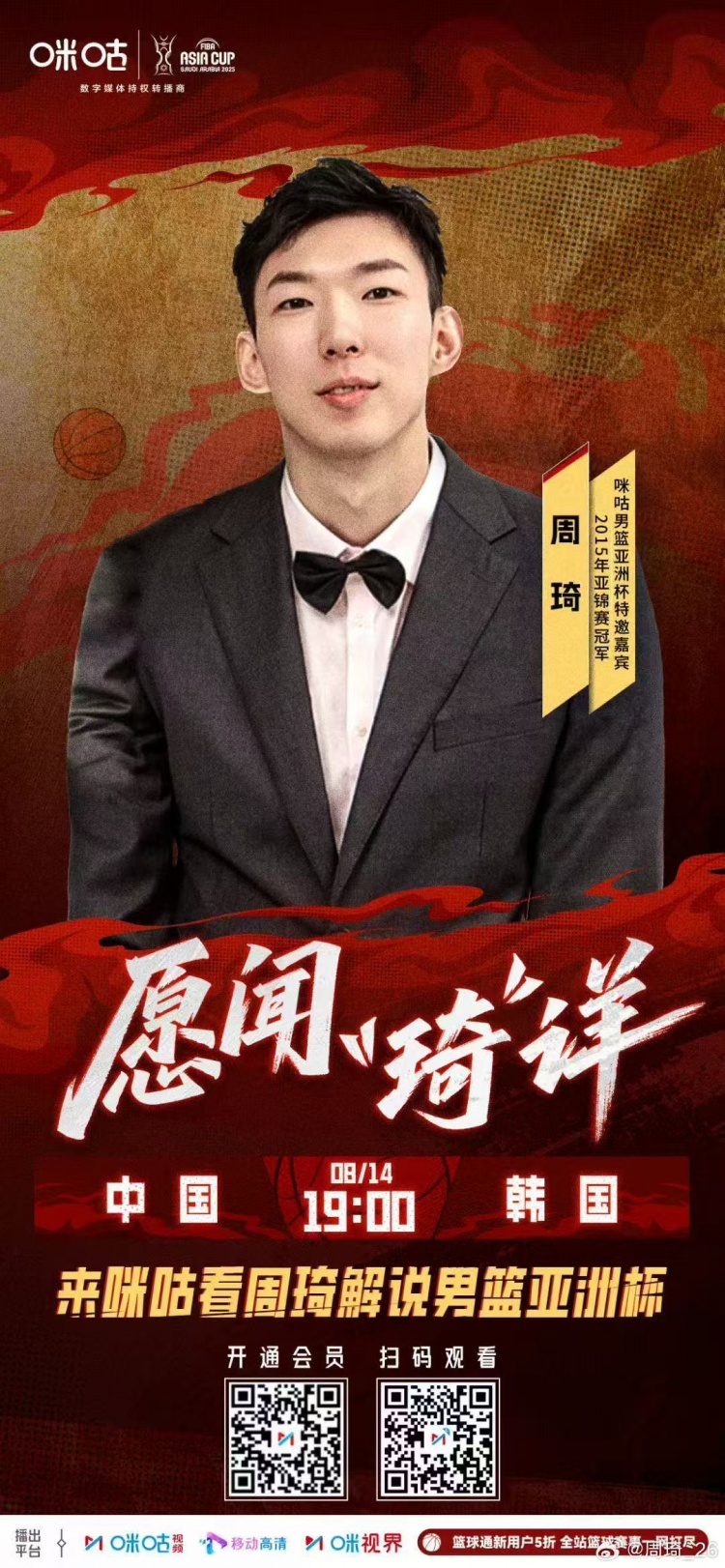 此前,咪咕官方宣布,周琦和前國(guó)手李根將擔(dān)任本場(chǎng)比賽解說嘉賓。