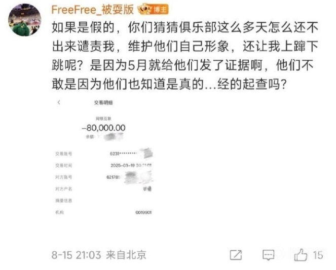 爆料女在評論區(qū)曬出3月19日為徐杰轉(zhuǎn)賬8萬元的截圖,但是被和諧了。