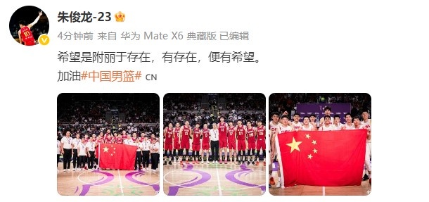 賽后,男籃小伙子朱俊龍?jiān)趥€(gè)人社媒上曬出全隊(duì)和國(guó)旗的大合照,并寫道:“希望是附麗于存在,有存在,便有希望。