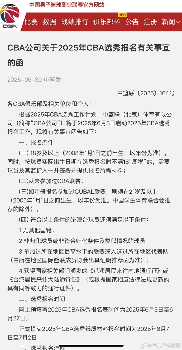 CBA官方公布選秀報名有關(guān)事宜,其中有兩項條款規(guī)定: